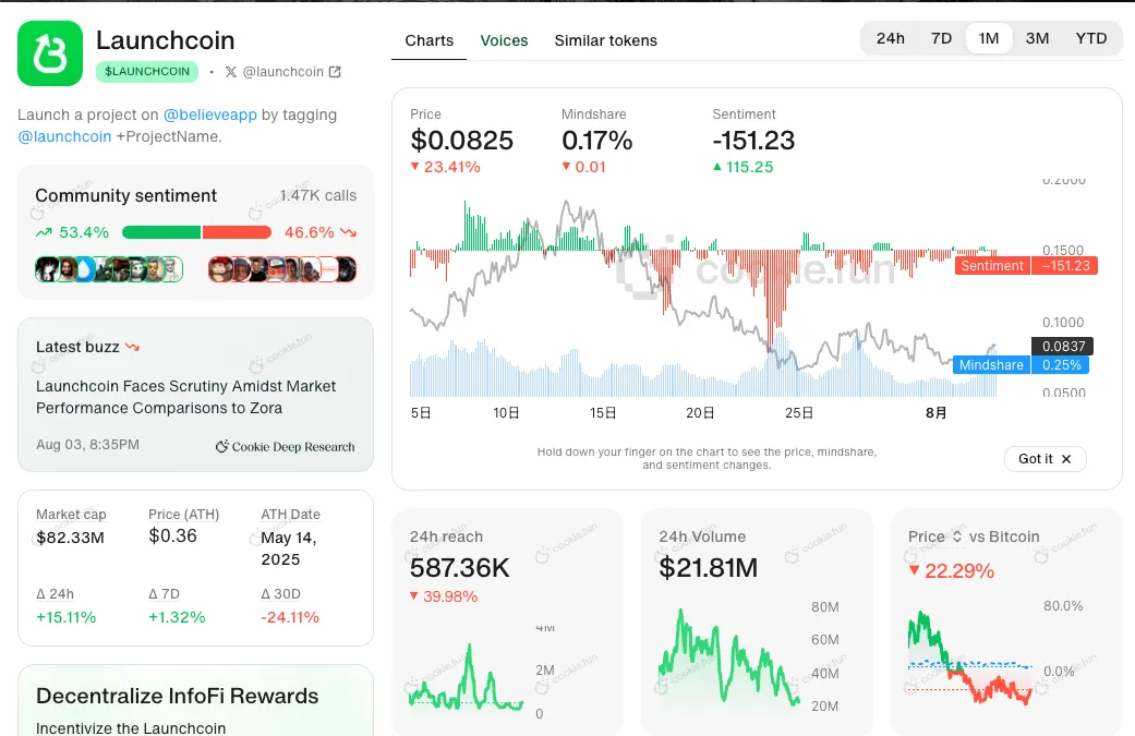 Kaito 和 Cookie.fun 等 Infofi 工具对 Crypto Twitter 做内容做聚合与舆情分析,给出 Mindshare、 Sentiment、Influence 的可量化指标。以 Cookie.fun 为例,其将 这两项指标数据直接叠加到价格图表上,把链下情绪变成可读的 “技术指标”。