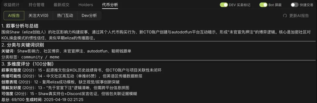 在 Twitter 等社交平台,诸如 XHunt 的小工具可帮助 Meme 玩家分析项目的 KOL 关注列表,以判断项目背后的关联人以及潜在注意力传播链。6551 DEX 通过聚合推特、官网、推文评论、发盘记录、KOL 关注等,为交易者生成完整的、随舆情实时变化的 AI 报告,帮助交易者精准捕捉叙事。