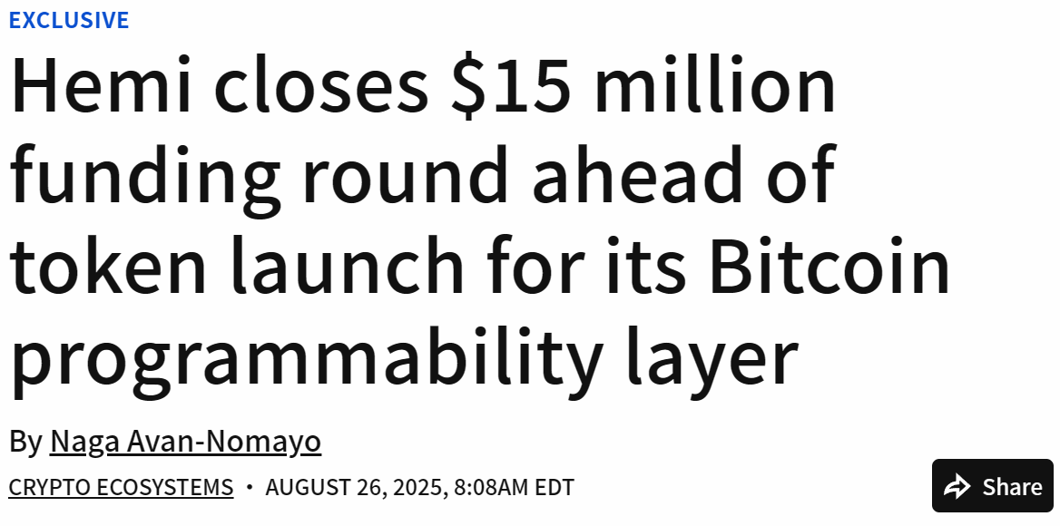 - 比特币可编程层项目 Hemi 完成 1500 万美元新一轮融资