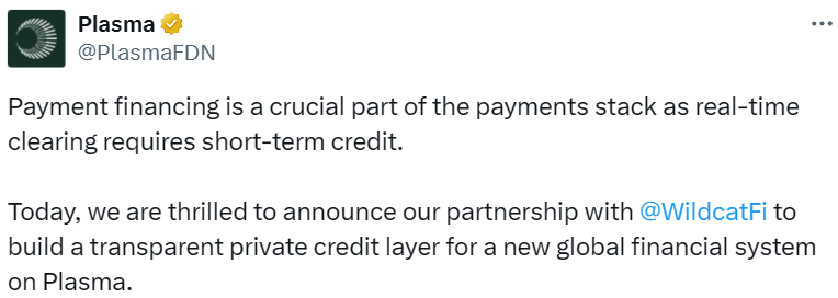 - Plasma 宣布与 Wildcat 合作构建透明私人信贷层