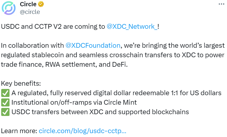 - Circle 宣布 USDC 与 CCTP V2 将上线 XDC 网络