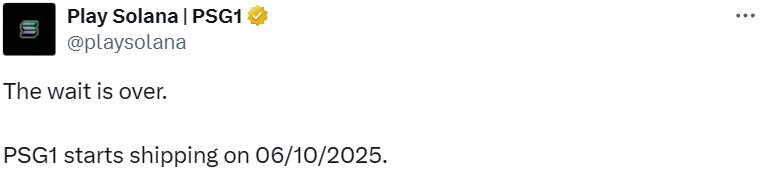 - Play Solana 游戏掌机 PSG1 将于 10 月 6 日起发货