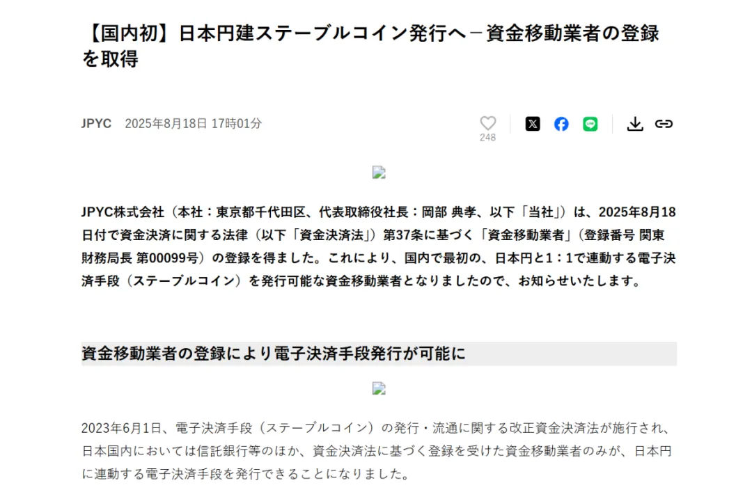 在日本,JPYC 成为首个获批的日元稳定币,由 JPYC Inc. 发行,并受资金转移服务提供商牌照监管,将由政府债券等流动性资产支持,日本金融服务厅(FSA)计划最早于今年秋季批准,目前已完成汇款业务运营商注册,并计划将其日元稳定币部署在以太坊、Avalanche 和 Polygon 网络上。
