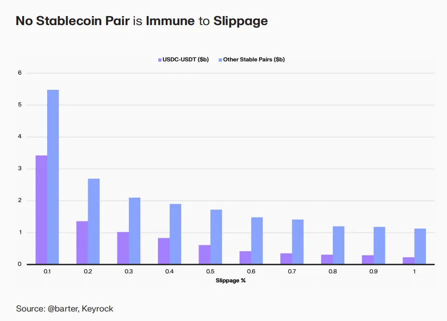 在以太坊上,稳定币之间的滑点依旧普遍。仅 DAI–FRAX、GHO–TUSD 等低流动性对,就有超过 54.8 亿美元的交易滑点超过 0.1%,其中 19 亿美元滑点超过 0.4%。即便是 USDC–USDT 这一最深流动性对,也有 54.2 亿美元交易滑点高于 0.1%,8.3 亿美元滑点高于 0.4%。没有哪一对能完全免疫。
