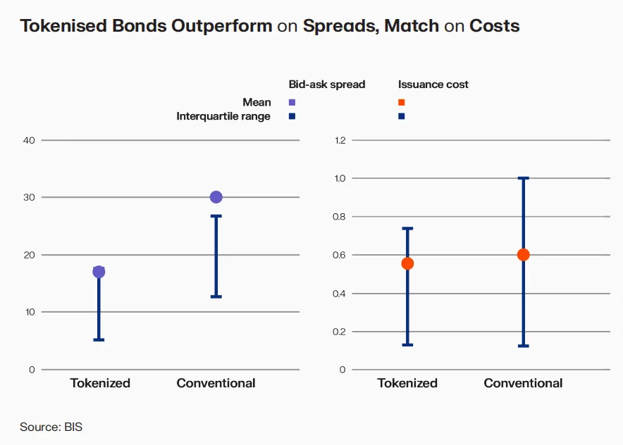 这一结构性转变已在债券市场显现。BIS 数据显示,代币化债券的买卖价差显著收窄——平均约 17 个基点,而传统债券为 30 个基点;发行成本则两者相当。这表明代币化市场不仅赎回更快,价格效率也更优。