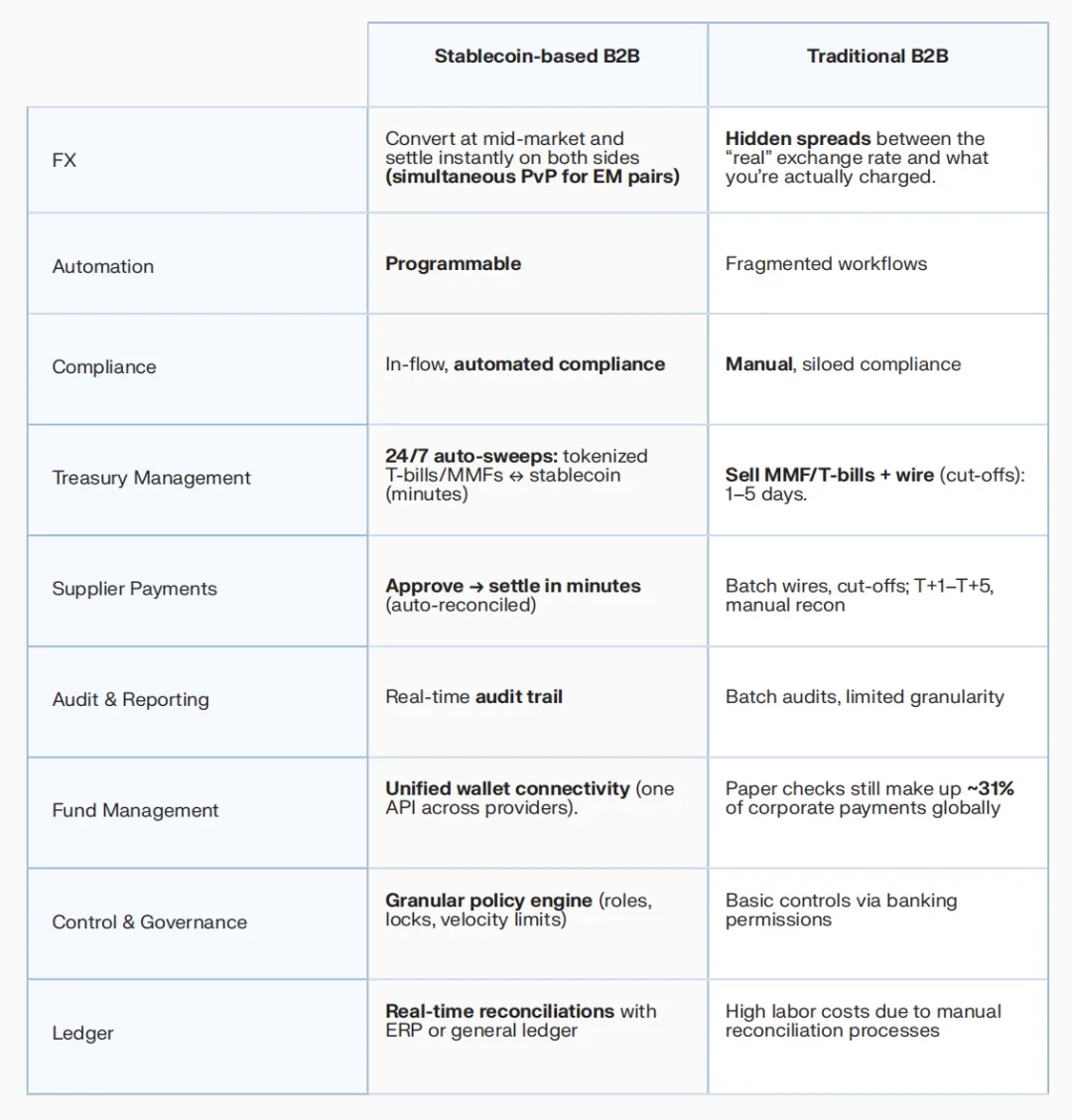 在企业财务与 B2B 场景,可编程稳定币正带来以下变革: