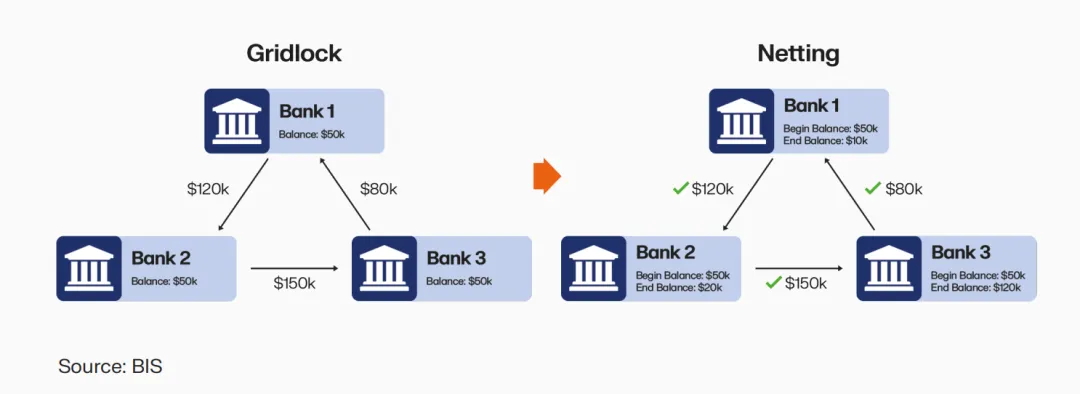 下图展示了一种情景:若各家参与银行因资金不足而无法逐笔完成支付,系统便会陷入 “死锁”。此类瓶颈通常需由央行出面化解。