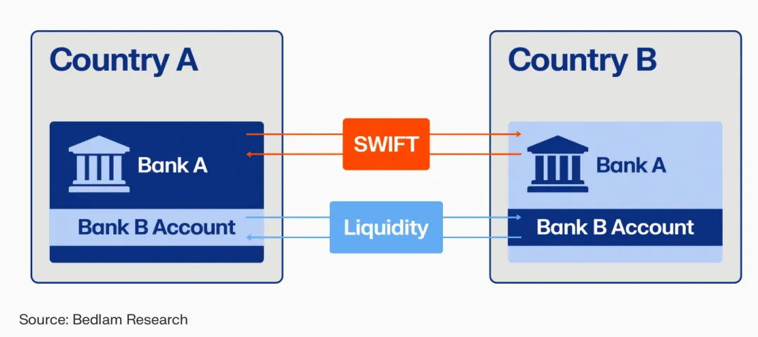 几乎同时,1977 年 SWIFT 上线,以标准化、加密电文取代电传。但它只解决了一半问题:SWIFT 只传输指令,却不移动资金。结算依旧依赖老旧的代理行链路——虽然用户界面升级了,但是支付通道仍是老旧的。