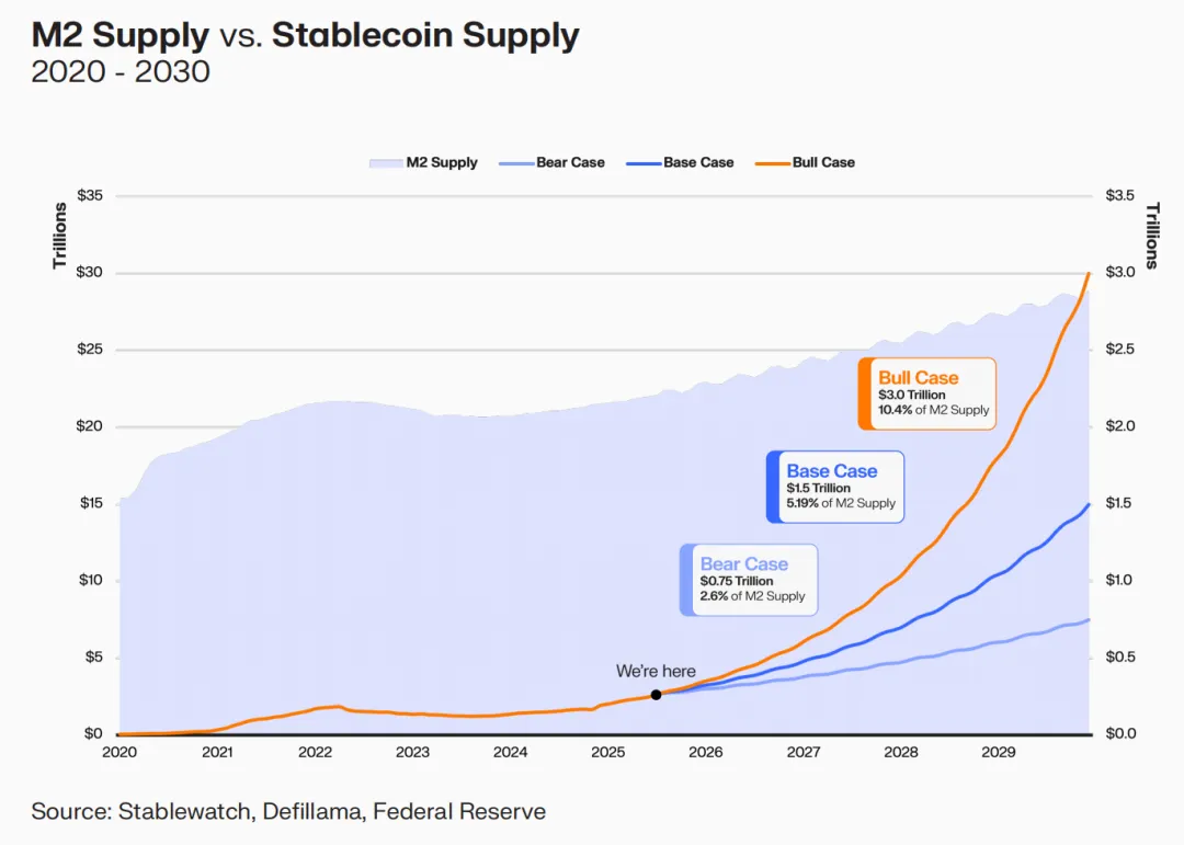 稳定币不仅是新货币形态,更是货币流动的新模型:通过最小化运营摩擦、降低合规成本、释放被锁定的流动性,打造一种根本更高效的全球价值转移方式。它们在美国 M2 中的占比已从 2020 年的 0.04% 升至如今的 1% 以上;若保持当前轨迹,2030 年可达美国货币供应量的 10%,标志着一个平行货币层的崛起。