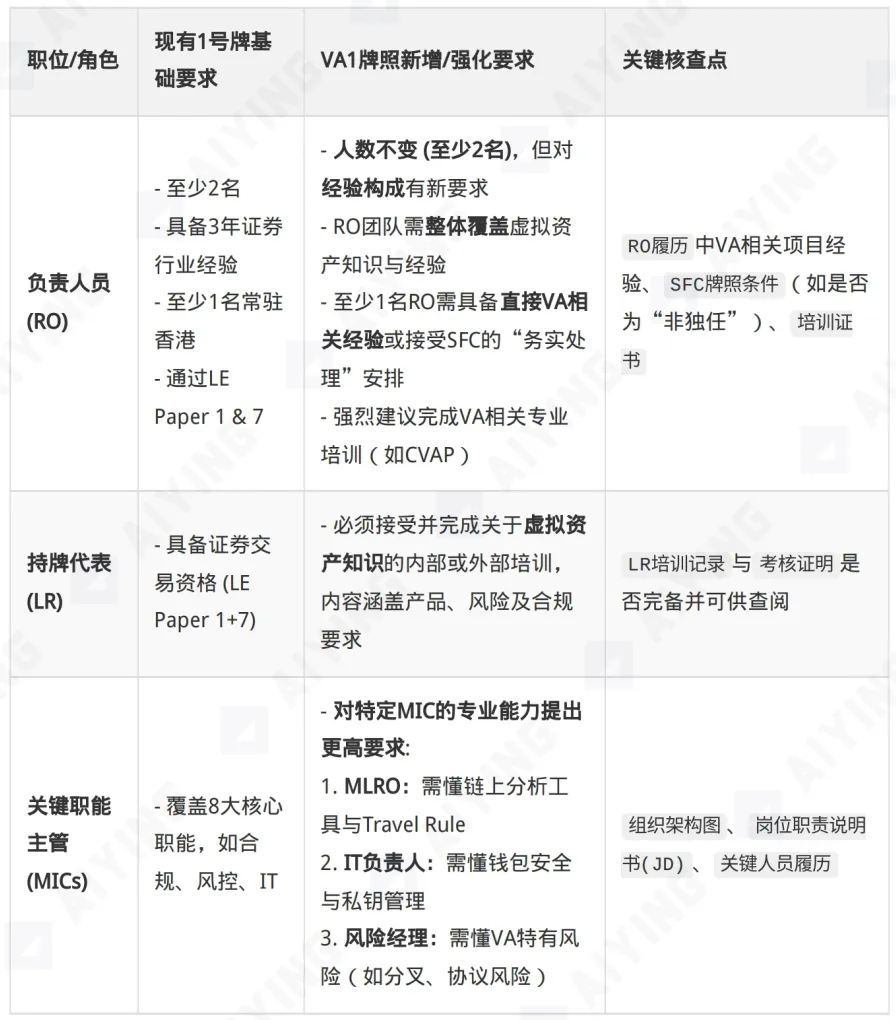 本章节是报告的核心,我们将依据 Aiying(艾盈)为客户申牌的经验以及 SFC 的官方指引、通函及市场实践,全面、系统地拆解升级 VA1 牌照所涉及的各项人员配置要求。SFC 的审查逻辑是穿透式的,不仅审查纸面上的组织架构,更会深入评估每个关键岗位人员的实际胜任能力。任何一个环节的短板都可能导致申请被延误甚至拒绝。