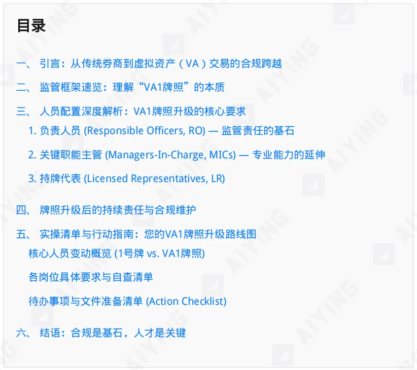 Aiying(艾盈)本报告旨在为已持有 SFC 1 号牌的持牌法团之管理层、合规负责人(Compliance Officer, CO)及负责人员(Responsible Officer, RO)提供一份权威、详尽的行动指南。我们将系统性地梳理和解析从传统 1 号牌升级至提供虚拟资产交易服务(下文为方便论述,简称 “VA1 牌照”)所需满足的全部人员要求,剖析监管机构背后的逻辑与考量,并提供可落地的实操清单。本文所有信息均基于 SFC 截至 2025 年 8 月的官方指引、最新通函、咨询文件及权威市场实践案例,旨在帮助您的机构精准导航,稳健地完成这场至关重要的合规跨越。