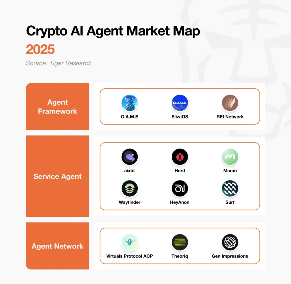 加密领域内的 AI 代理板块从 2024 年底开始受到关注。ai16z 团队的 ElizaOS 和 Virtuals Protocol 团队的 G.A.M.E 开发栈显著降低了代理开发的门槛。DAOS.fun 和 Virtuals Fun 等启动平台为将开发出的代理代币化提供了平台。从开发到发布的过程变得简化,市场兴趣爆发,大量代理项目迅速涌现。