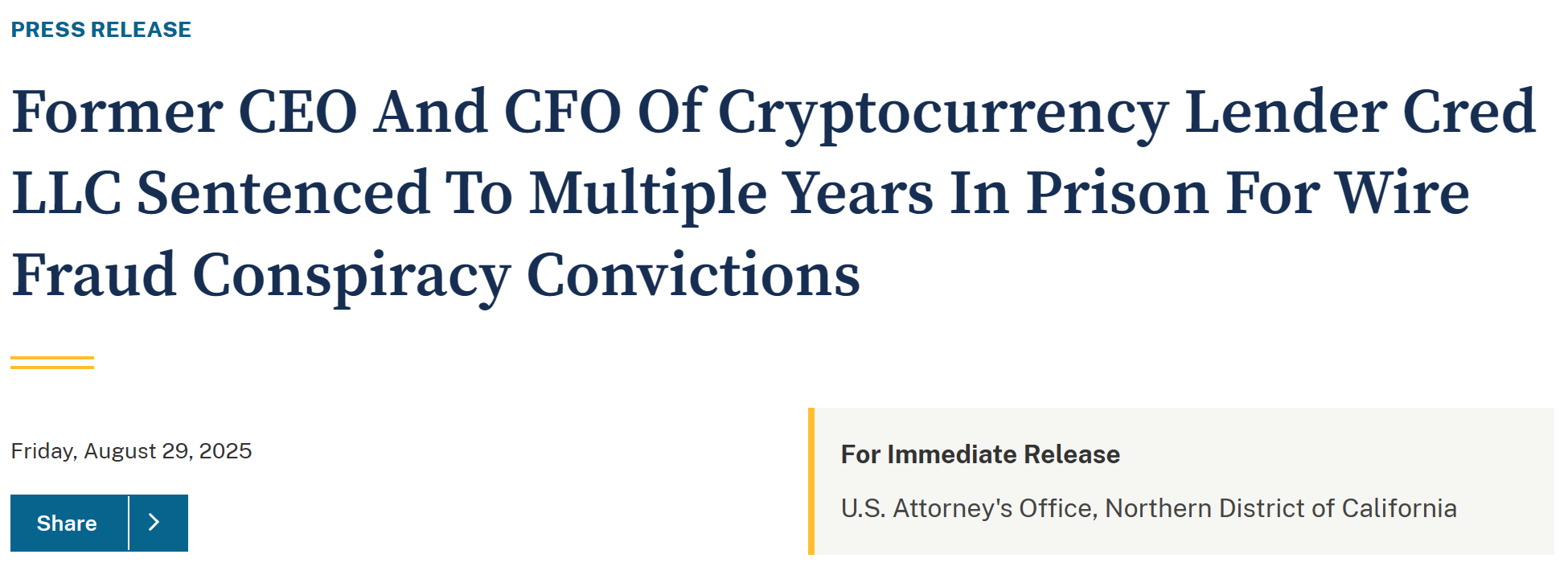 - 加密贷款机构 Cred LLC 前 CEO 及 CFO 因电汇欺诈共谋罪获刑多年