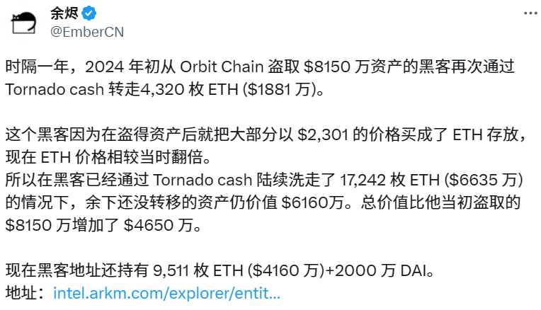 - Orbit 黑客因 ETH 上涨使盗取资产增值 4650 万美元
