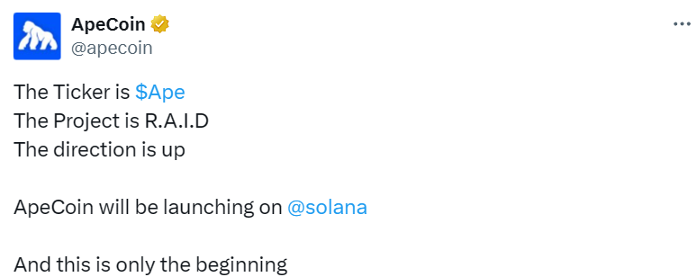 - APE Token 将扩展至 Solana 链上并进行 DeFi 集成