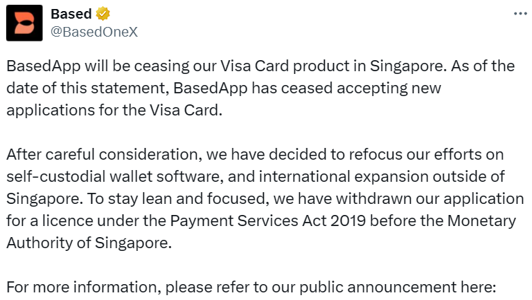 - BasedApp 将在新加坡停止提供 Visa 卡产品