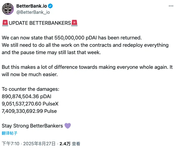 2025 年 8 月 27 日,基于 PulseChain 的 DeFi 项目 BetterBank 遭攻击,损失约 500 万美元。攻击者利用合约漏洞铸造任意代币,其中部分代币被兑换成 ETH。攻击者随后归还了约 5.5 亿 pDAI(约 270 万美元)的被盗资产。