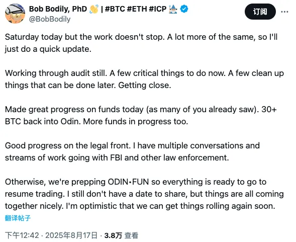 2025 年 8 月 12 日,基于比特币的迷因币发行平台 ODIN.FUN 遭攻击,损失约 58.2 BTC(约 700 万美元)。攻击者疑似通过操纵多个代币的价格,再基于虚高的价格提取比特币。8 月 17 日,ODIN.FUN 联合创始人 Bob Bodily 表示:“今天在资金方面取得了重大进展(很多人已经看到了)。已有 30 多枚 BTC 回流 ODIN,更多资金也在处理中。”