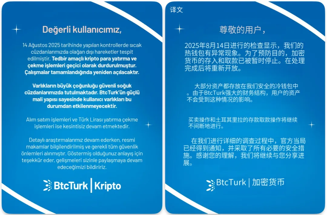 2025 年 8 月 14 日,土耳其加密货币交易所 BtcTurk 疑似再遭攻击,损失约 5400 万美元。此前,在 2024 年 6 月 22 日,BtcTurk 遭遇攻击,损失约 9000 万美元。
