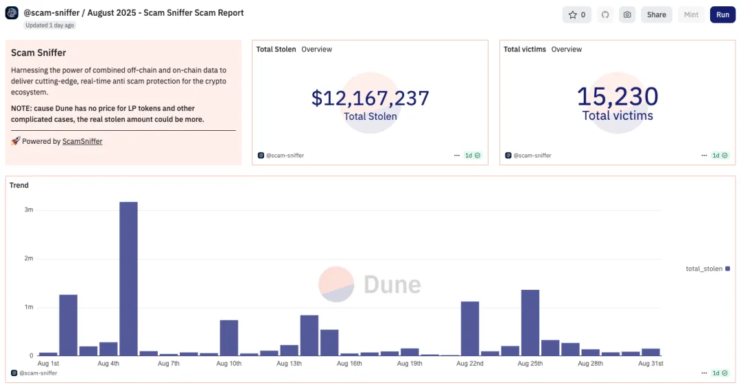 2025 年 8 月,Web3 安全事件总损失约 8289 万美元。其中,据慢雾区块链被黑档案库 (https://hacked.slowmist.io) 统计,共发生 9 起被黑事件,导致损失约 7073 万美元,有 630 万美元得到冻结或返还,事件原因涉及合约漏洞、跑路和账号被黑等。此外,据 Web3 反诈骗平台 Scam Sniffer 统计,本月有 15,230 名钓鱼事件受害者,损失规模达 1216 万美元。