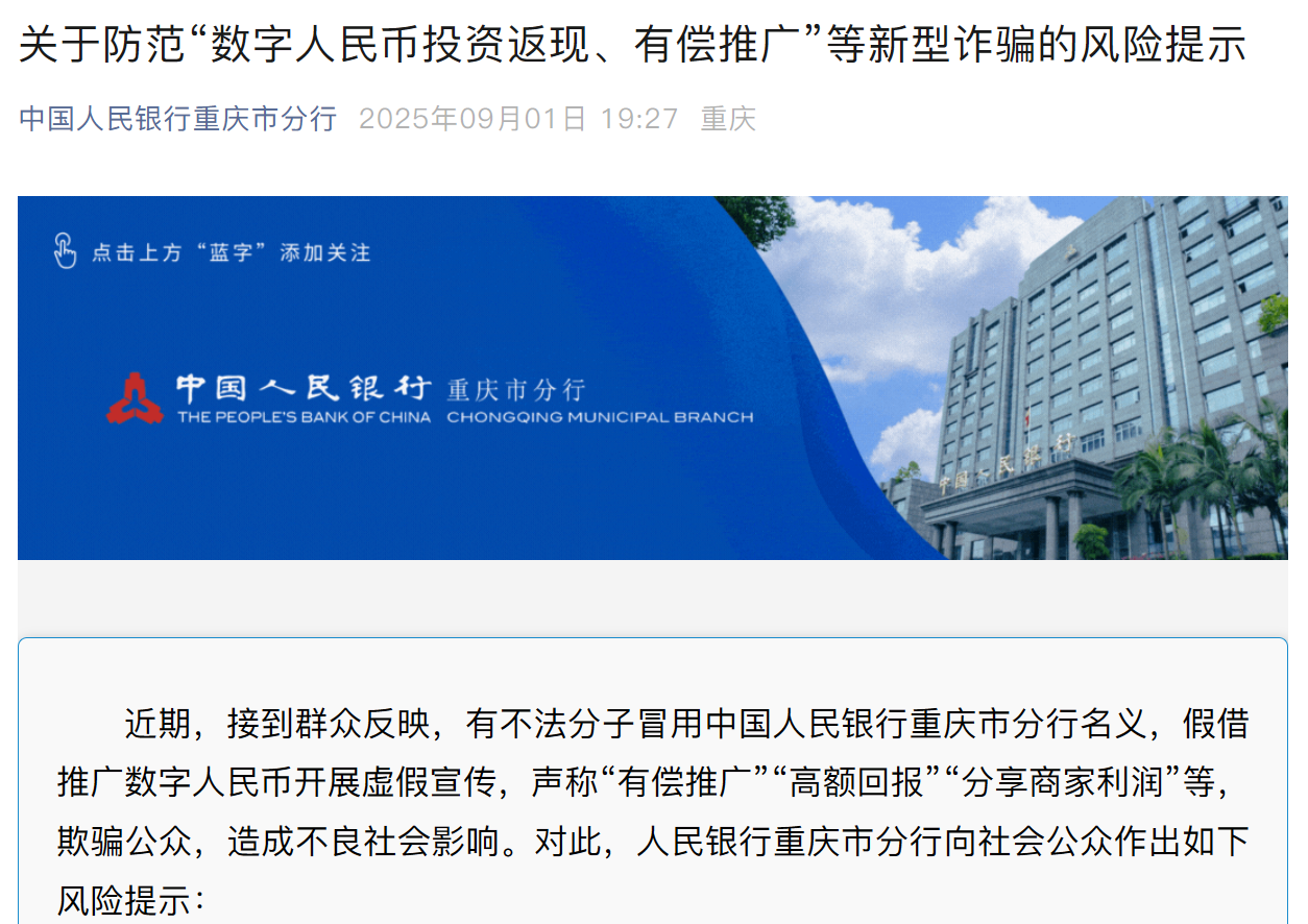 - 中国人民银行重庆市分行发布防范「推广数字人民币返利」诈骗风险提示