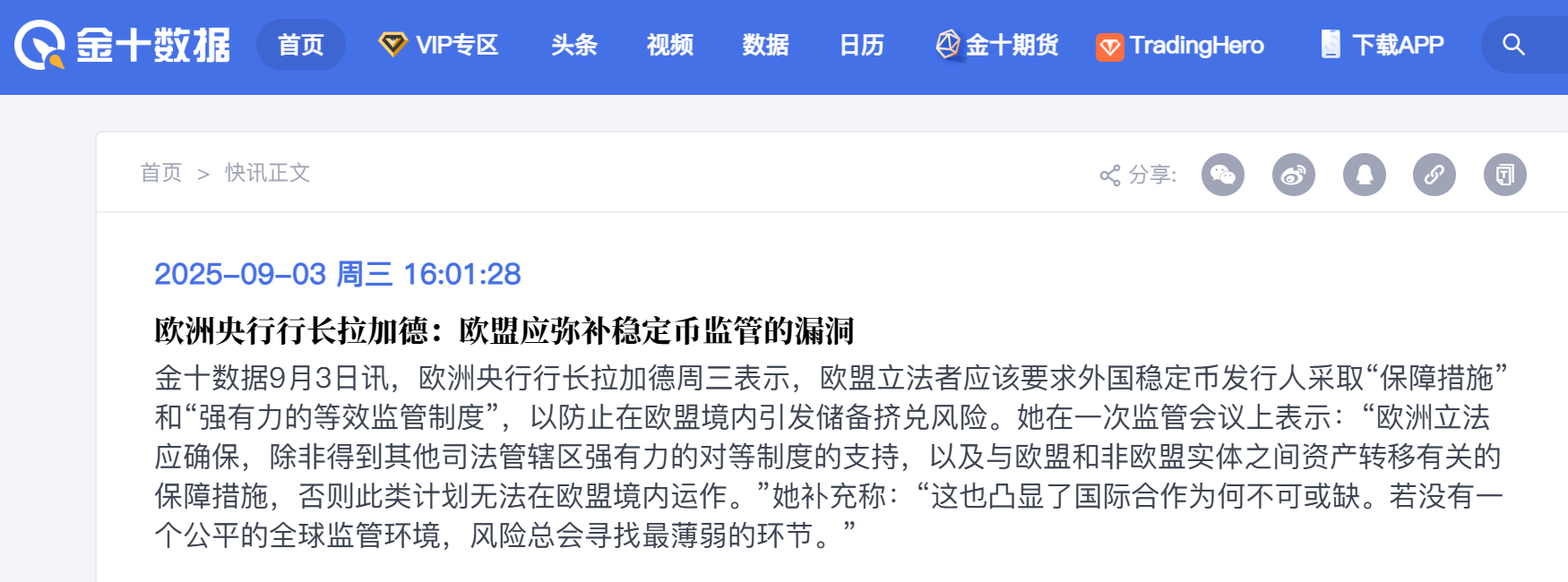 - 欧洲央行行长拉加德:欧盟应弥补稳定币监管的漏洞