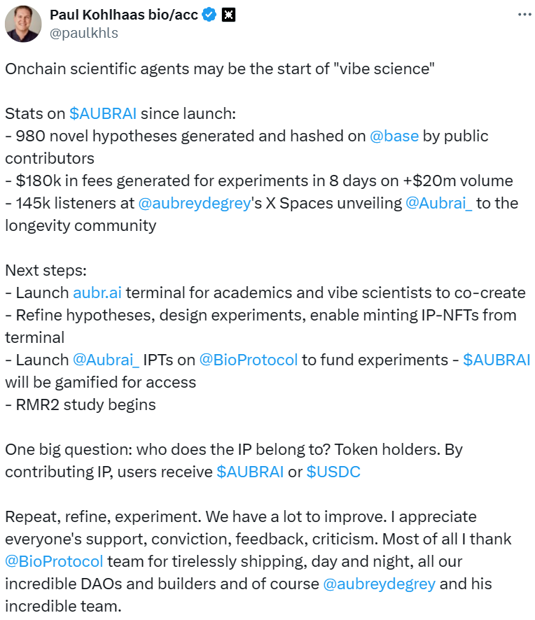 - Bio Protocol 创始人计划推出 Aubrai 终端,启动 IP-NFT 铸造及智能代理系统