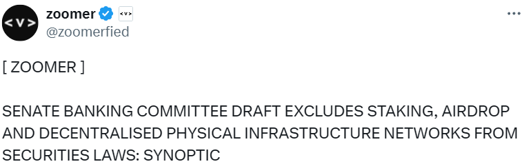 - 美参议院银行委员会草案将质押、空投和去中心化实物基础设施网络排除在证券法外