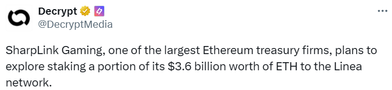 - SharpLink Gaming 计划在 Linea 主网启动后将其以太坊财库中部分进行质押