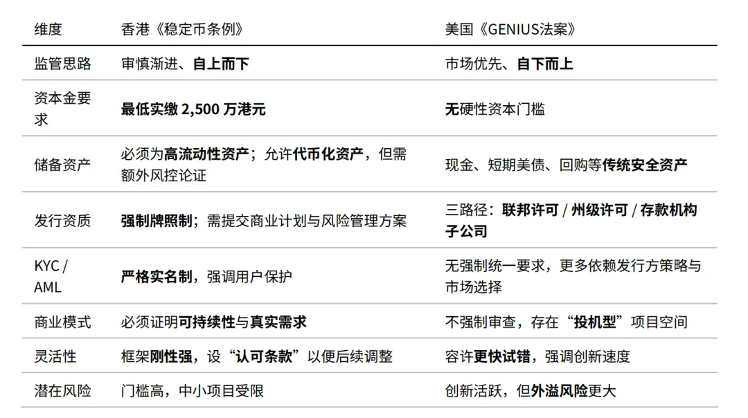 2025 年 8 月 1 日,香港《稳定币条例》正式生效,确立全球首个专门针对法币锚定型稳定币的监管框架,体现 “审慎渐进” 的监管风格:高资本金门槛、严格储备要求、KYC 实名制,以及对商业模式可持续性的审查。而美国《GENIUS 法案》则采取 “市场优先” 的思路,不设资本金硬性要求,发行路径多元,更多依赖市场筛选与用户选择。