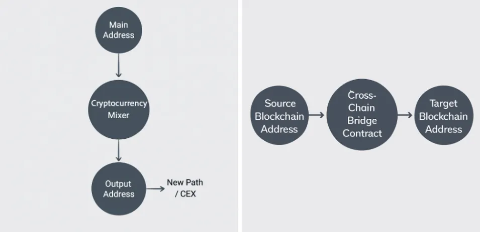跨链桥与隐私工具结合使用,是另一类常见洗钱路径。交易者通常先通过跨链桥将稳定币转移到不同区块链,再将 USDT/USDC 兑换为 ETH、BTC 等资产,最终投入混币服务(如 Tornado Cash)以打断资金可追溯性。通过图网络分析和交易行为模式识别,可以锁定潜在可疑资金流。经混币协议和跨链桥多次拆分与合并后,资金最终可能进入中心化交易所,形成复杂资金路径,增加 AML 追踪难度。