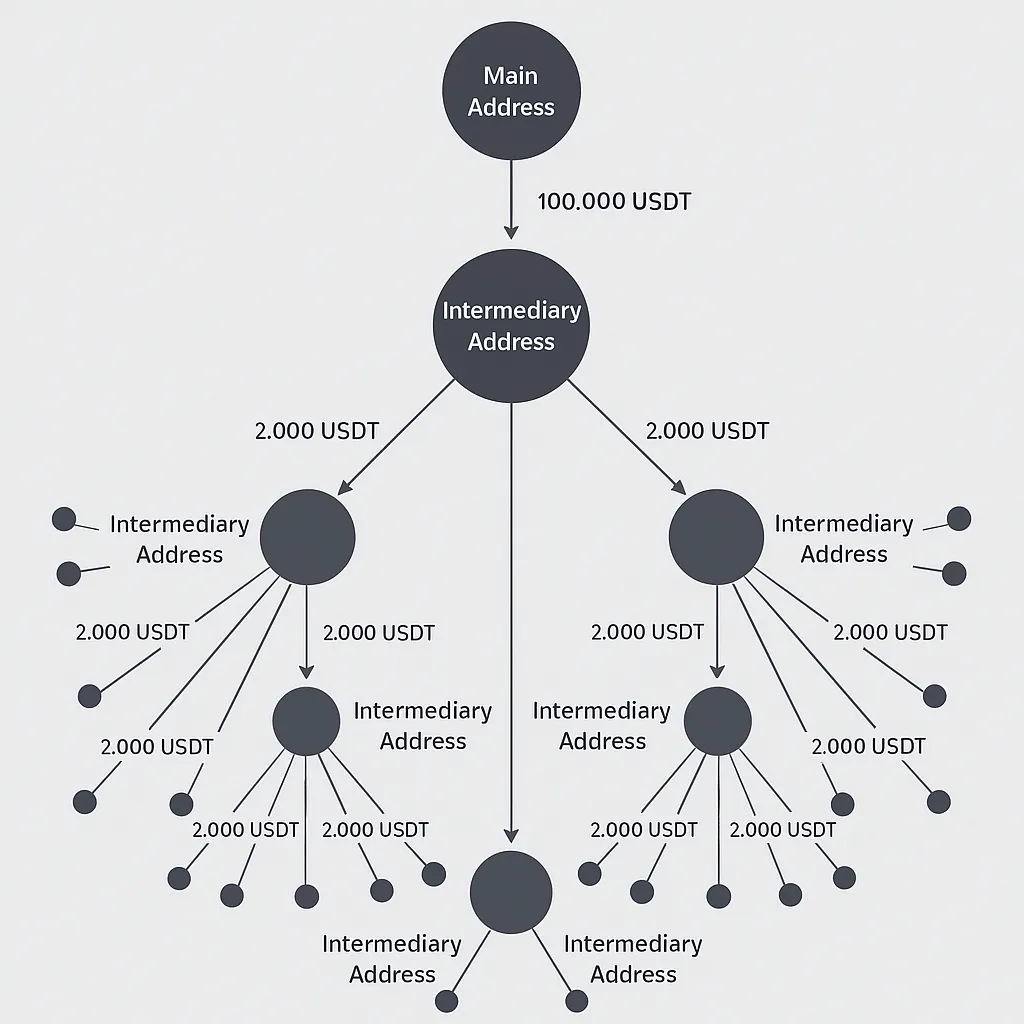 获得稳定币后,洗钱方通常将大额资金拆分为多笔小额交易,分散至多个新生成地址,以掩盖资金来源和规模。随后,这些资金可能通过不同 DEX 进行二次兑换,或跨链转入其他区块链,再回流至目标账户。技术上,可通过交易网络复杂度、资金流入流出比异常及跳数统计,识别潜在可疑模式。类似路径常出现在黑客攻击或资金窃取事件中,例如黑客盗取的稳定币常在短时间内完成数十次链上拆分,以增加冻结难度和追踪复杂度。
