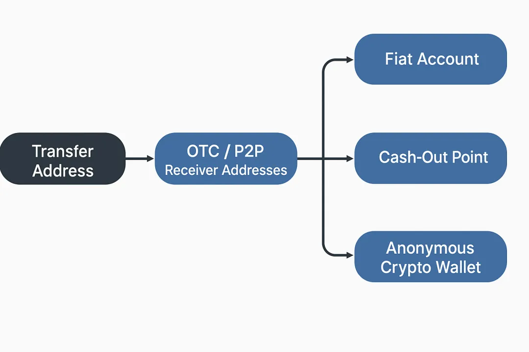 OTC 场外换汇是稳定币 AML 风险的重要来源之一。通过未受监管或缺乏严格 KYC 流程的场外交易平台,交易者能够将法币兑换为稳定币,从而在一定程度上绕过监管和审查。此类交易往往伴随大额资金跨境转移,并增加链上追踪难度。黑灰产资金常以现金或非法来源法币进入 OTC 市场,再直接兑换为 USDT/USDC 等稳定币。由于 OTC 商户普遍缺乏完善 KYC/AML 流程,这一环节成为资金上链的隐蔽通道。链上监控中可通过资金流向聚类及高风险 OTC 钱包标签比对,对潜在风险资金进行识别。