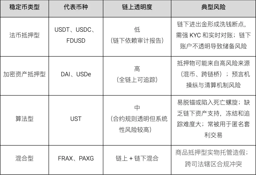 这些分类差异不仅影响稳定币的技术实现,还决定了不同类型的稳定币在 AML 风险画像上的差异:法币抵押型的重点在于链下账户与铸销环节的 KYC 与审计,加密抵押型则依赖链上可追踪性与复杂的抵押机制,而算法型则对异常交易模式与系统性风险监测提出更高要求。随着稳定币模式不断演化,如何在不同技术路径下构建灵活而统一的 AML 监测框架,已成为全球监管机构与行业合规团队的共同课题。