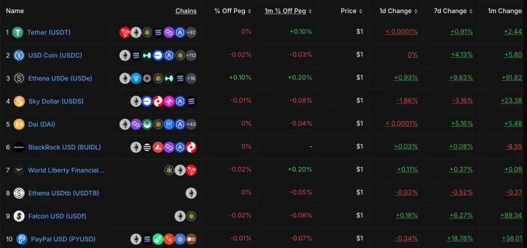 观察市值前十的稳定币结构,可以发现:法币抵押型稳定币仍然占据主导地位,其中包括 USDT、USDC、BUIDL、USD1、USDf、PYUSD 等,这类稳定币依靠法币或国债等传统金融资产作为储备,合规性和市场接受度较高。去中心化的加密资产抵押稳定币中,仅有 DAI 挤入前十。与此同时,部分算法型或混合型稳定币也开始崭露头角,例如采用合成美元 + 套保模型的 USDe ,结合算法与部分抵押机制的 USDS,延续合成美元 + 对冲模式的 USDTB。稳定币市场在法币抵押模式占优的同时,也在不断探索新的技术路径与实验性机制。