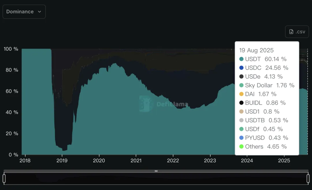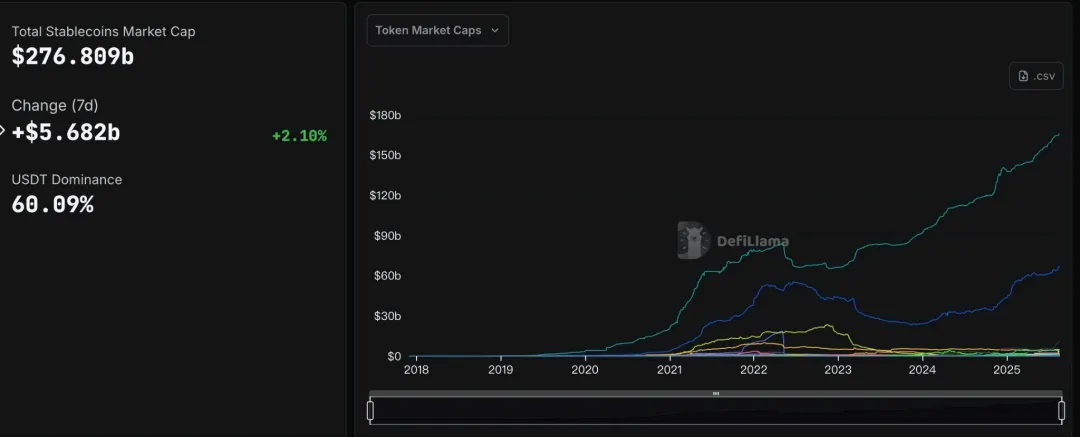 在理解了稳定币的基本形态与功能后,结合当前市场格局能够更直观地认识其发展动态。根据 DeFiLlama(https://defillama.com/stablecoins)的最新数据显示,截至 8 月 19 日,整体稳定币市场的总市值约为 2,768.09 亿美元。从市占率和市值分布来看,USDT 依旧保持领先地位,市值超过 1,663 亿美元,并在过去阶段呈现出相对稳定的增长趋势;USDC 以 679.18 亿美元位居第二,市值走势相对平稳,但与 USDT 仍存在较大差距;其他稳定币则整体规模有限,市值波动相对温和。