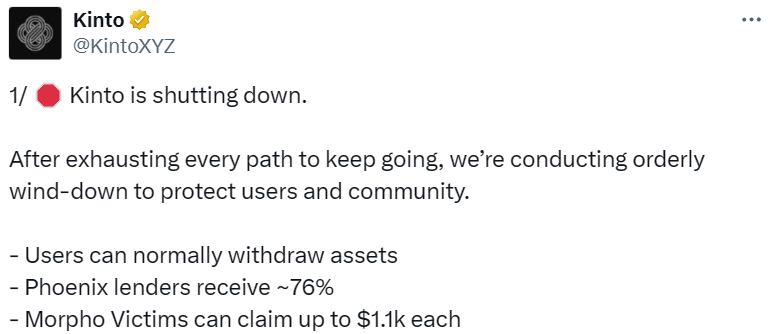 - Kinto 将关闭项目并启动用户资产兑付安排