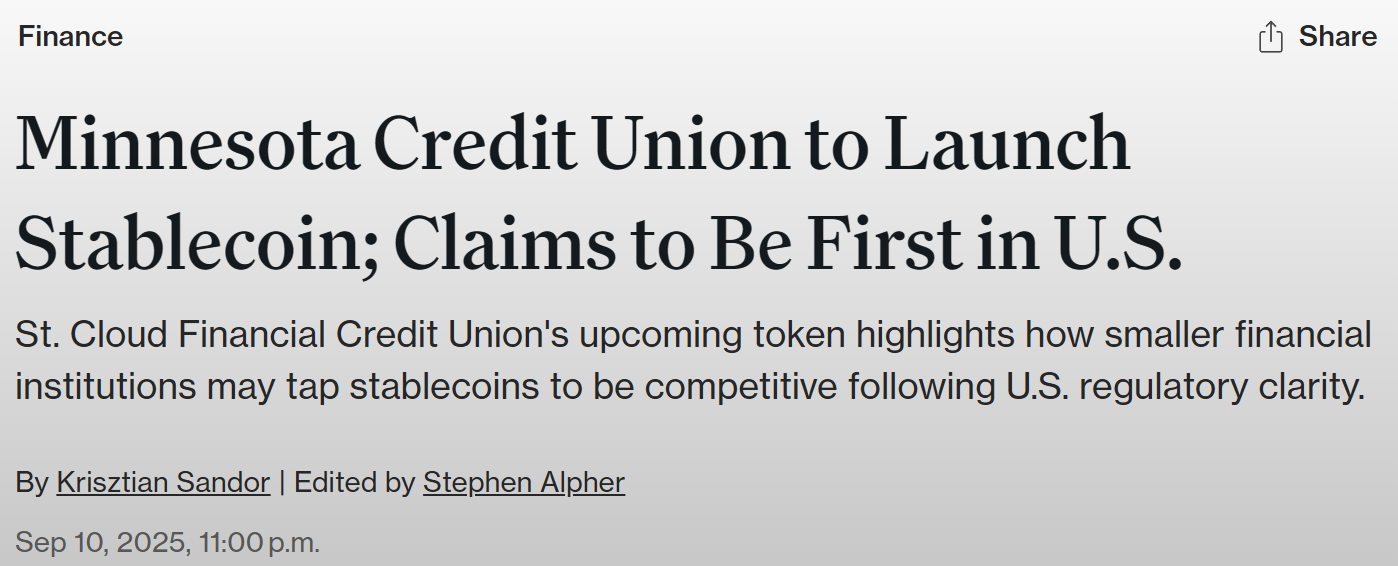 - 美国明尼苏达州信用合作社将推出稳定币 Cloud Dollar