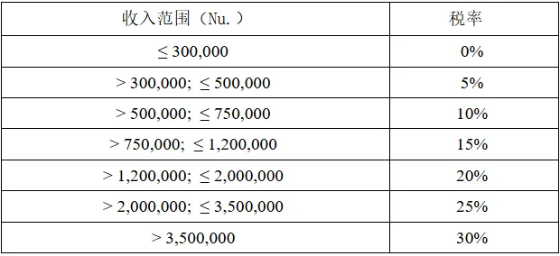 不丹的个人所得税以超额累进税率为基础,税率从 0% 到 30% 递增,适用于年收入超过 30 万努尔特姆的公民、居民以及在不丹有收入的其他个人。2025 年《所得税法》将原个人所得税(PIT)和商业所得税(BIT)合并至个人所得税下以简化税收结构。根据新法,具体的个人所得税的各级距税率如下: