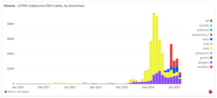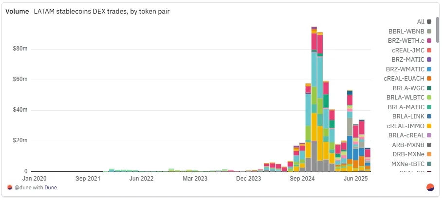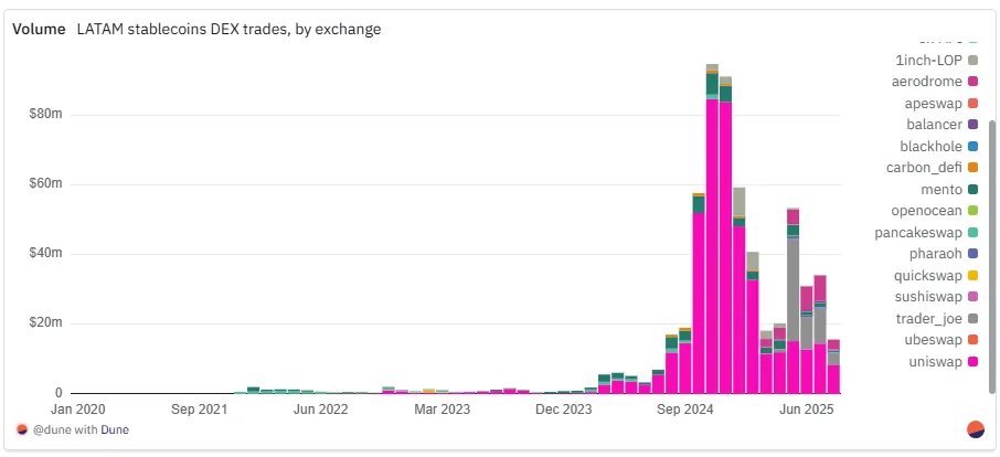对比之下,格局已然清晰:MXNB 如今主导小额、零售式支付;MXNe 则聚焦于大额结算。与巴西多元化、多链并存的雷亚尔生态相比,墨西哥市场仍集中在两家发行方和更少的链上,但这并未阻碍流动性的增长。自 2025 年年中以来,比索交易对已迅速跻身去中心化交易所成交量前列,标志着市场结构正走向成熟。
