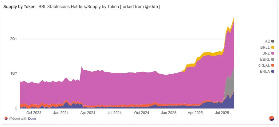 截至 2025 年 6 月,已有五种不同的 BRL 锚定稳定币在活跃流通,集中度下降,标志着生态走向成熟。尽管增长迅猛,BRL 稳定币整体仍处于早期阶段,当前流通规模约 2,300 万美元。此外,整个市场仍在快速演变。Iporanga Ventures 最新发布的《BRL 稳定币报告》指出,目前尚未出现绝对龙头,但项目级数据已呈现出各自的领先赛道: