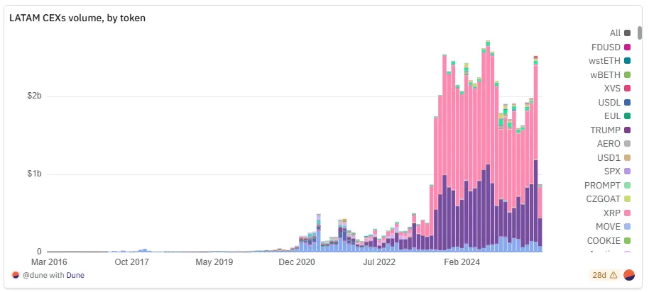 整体而言,区块链与代币数据强化了结构性叙事:拉美交易所在 “以太坊为主、稳定币驱动” 的基础上实现大规模扩张,偶尔出现投机激增可短暂重塑排名。