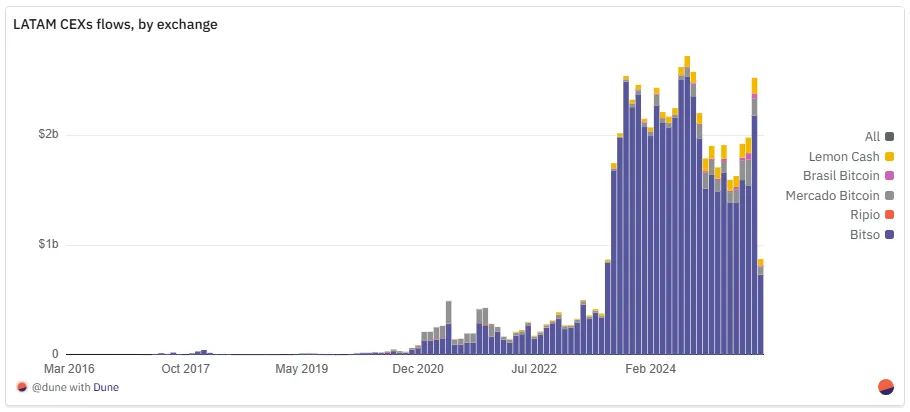 - 交易所(Lemon、Bitso、Ripio 等)是获取流动性的关键基础设施。中心化平台占据区域 68.7% 的加密成交量,与北美水平相当(Chainalysis,2024)。