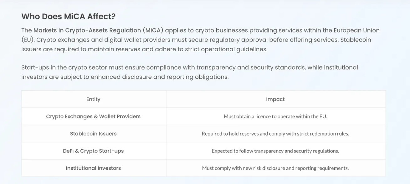 欧盟《加密资产市场监管法案》(MiCA)于 2024 年底正式生效,为 27 个成员国提供统一的规范性法规。该框架对代币进行严格分类(资产参考型、电子货币型等),并建立「单一许可」制度 —— 企业一旦获批,可在全欧盟范围内开展业务。MiCA 虽提供了法律确定性,灵活性却不足,目前暂未将 NFT 与 DeFi 纳入监管范围。