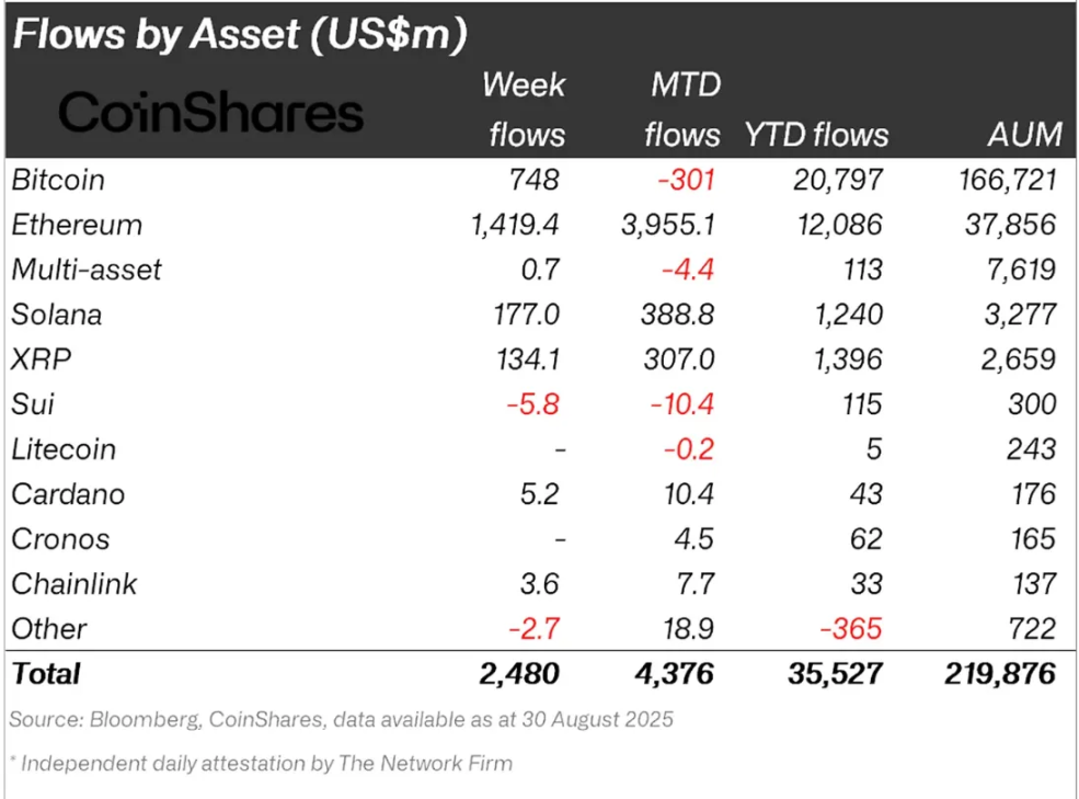 最直观的证据来自交易所交易产品(ETPs):2025 年年初至今,美国加密货币 ETP 净流入超 350 亿美元,其中以太坊基金占比最高;仅 8 月单月,流入规模就达 49 亿美元,近 40 亿美元流向以太坊相关产品。