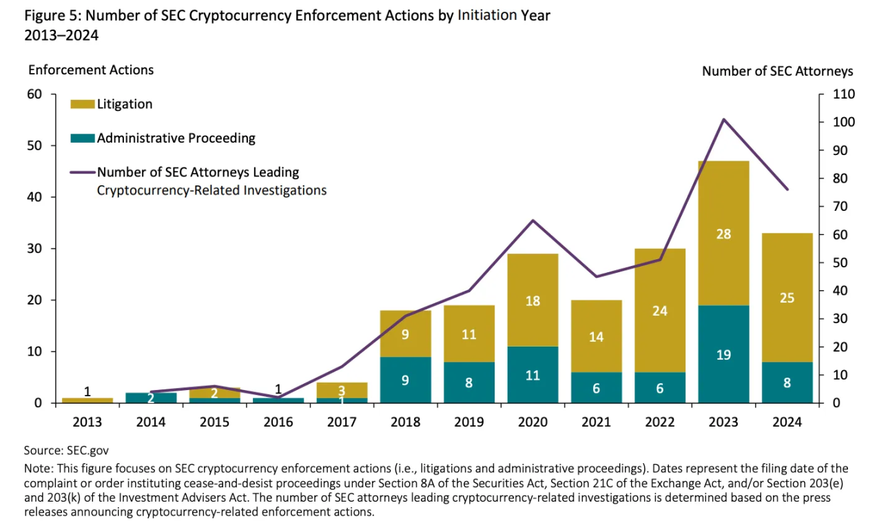 交易员们将这种现象称为「SEC 效应」—— 抛售并非由资产基本面驱动,而是源于监管执法相关的新闻。人才与资本纷纷流向欧洲(如欧盟《加密资产市场监管法案》MiCA)与亚洲(如新加坡许可制度),只因这些地区的规则至少明确了「允许做什么」。与此同时,华盛顿的 SEC 持续扩充执法人力:Gensler 任内,每起加密货币案件平均配备 8.3 名律师,远超其前任 Jay Clayton 时期的 5.9 名,足见诉讼驱动型监管的强度。