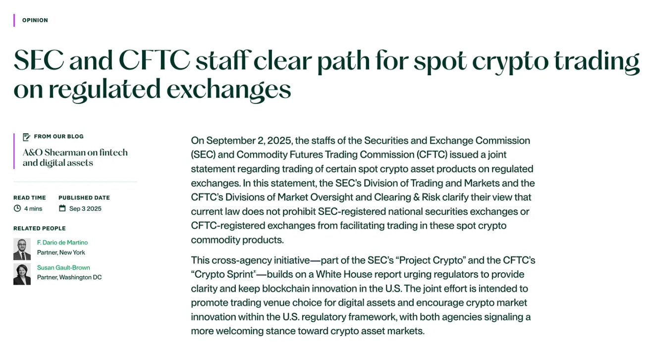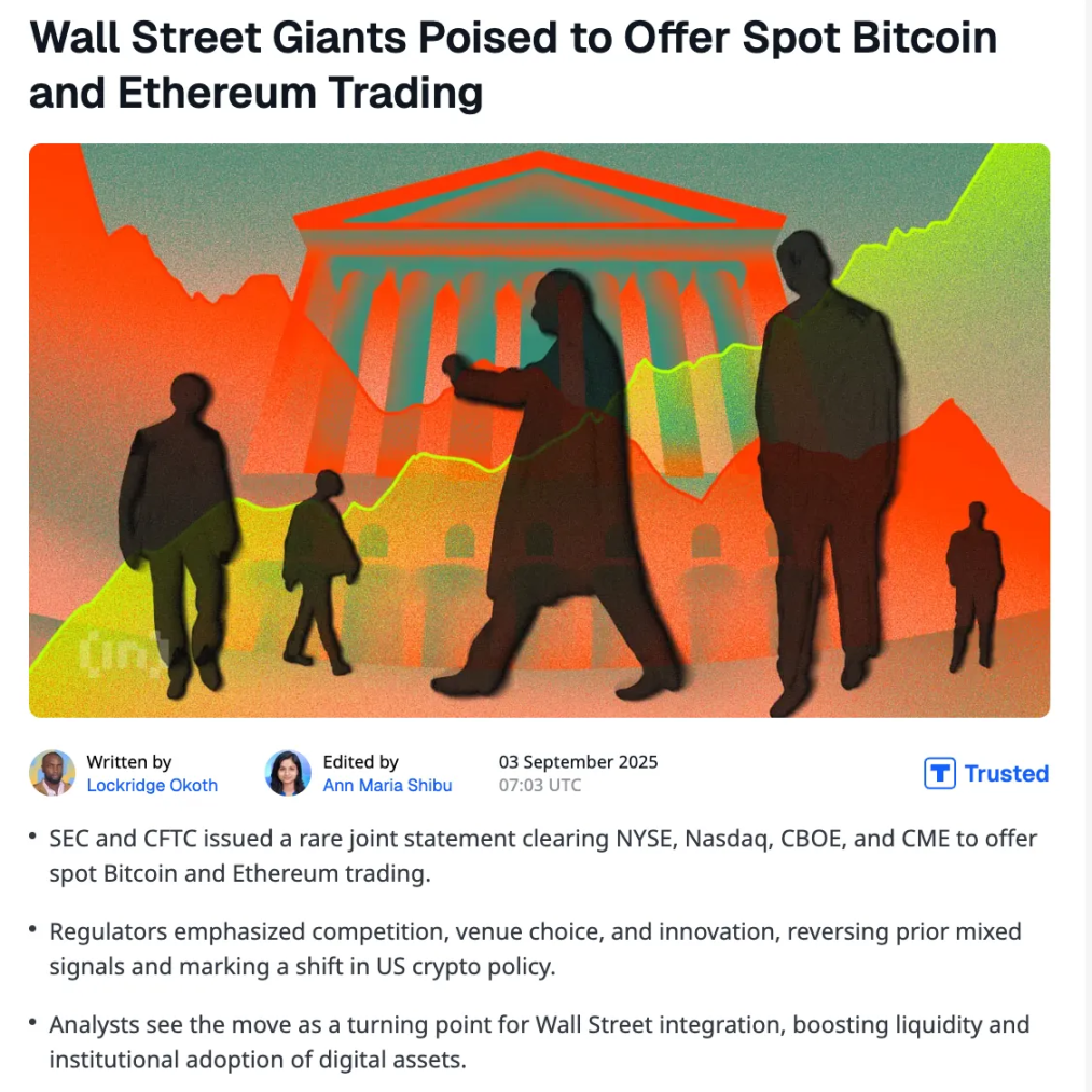 2025 年 9 月 2 日,SEC 与 CFTC 的联合声明震动市场,明确现行法律不禁止纳斯达克、纽约证券交易所(NYSE)、芝加哥商品交易所(CME)等全国性交易所上市比特币与以太坊现货产品。
