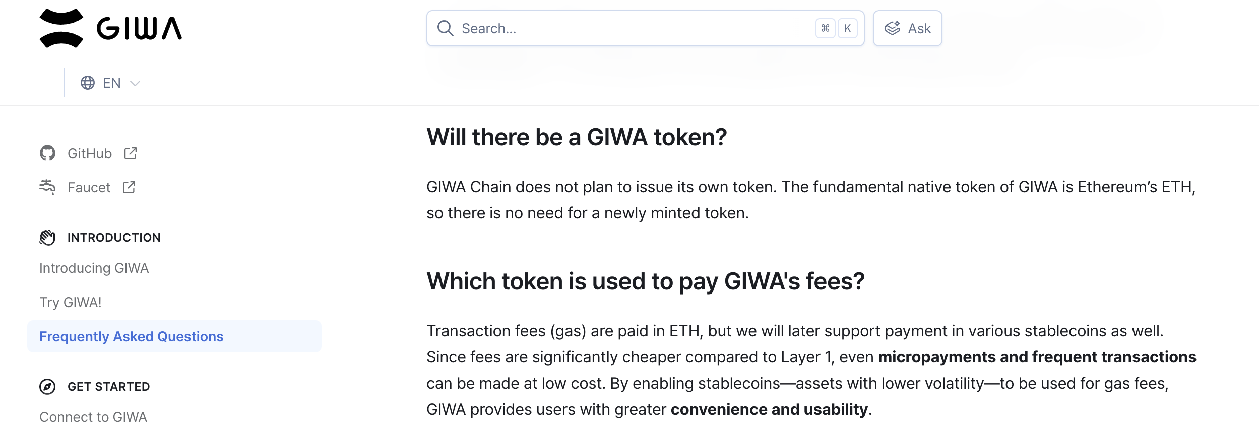 是否发行代币是社区的关注焦点之一,GIWA 给出了明确的答案:不会。官方文档称,GIWA 的基础原生代币是以太坊的 ETH,因此无需新发行代币。