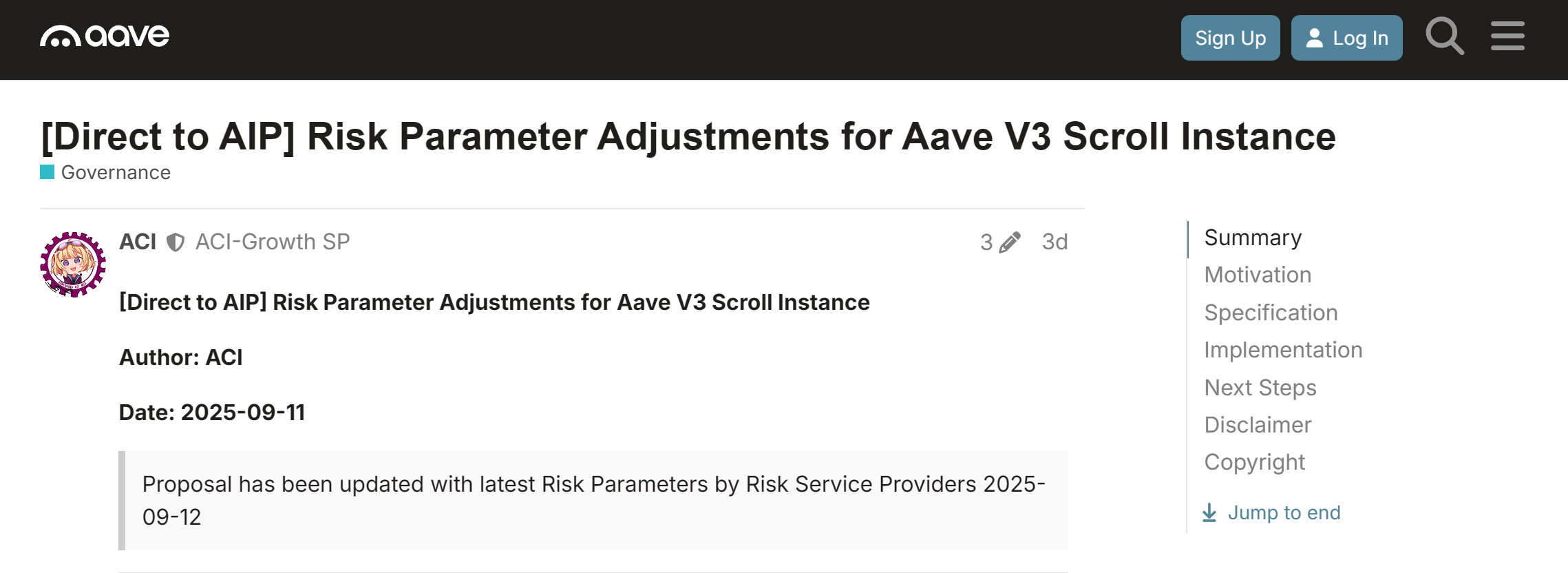 - Aave 社区发布「Aave V3 Scroll 实例风险参数调整」提案