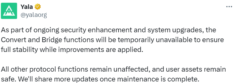 - Yala 暂停 Convert 和 Bridge 功能进行系统升级